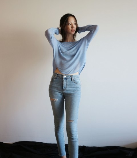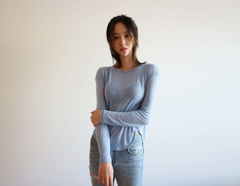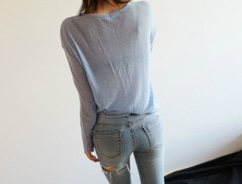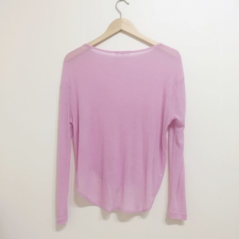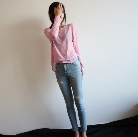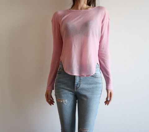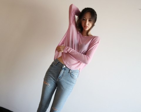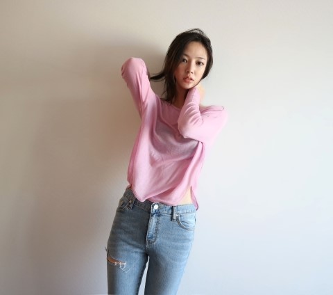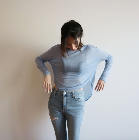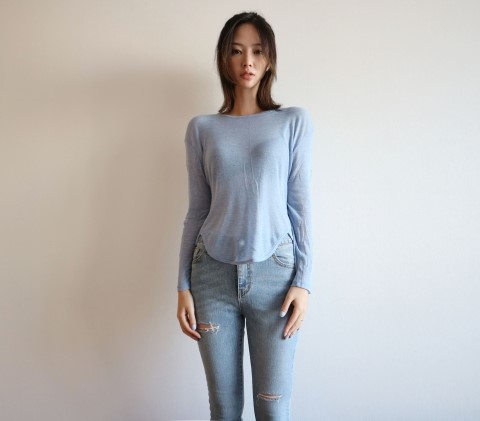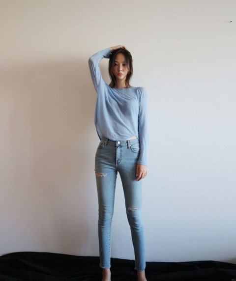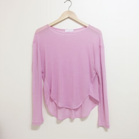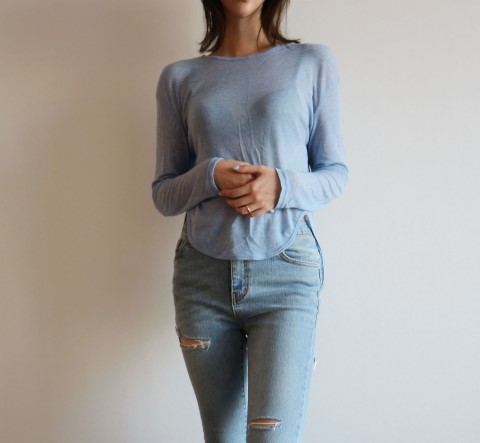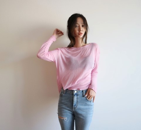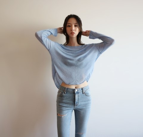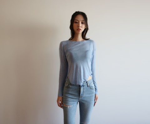 부드럽게 떨어지는 실루엣에 여리여리한 핏이 가미된 시스루 스타일에 긴팔 티셔츠에요.